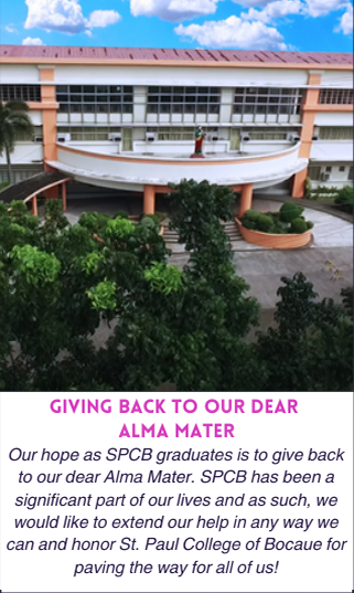 The St. Paul College of Bocaue Alumni Association (SPCBAA) values its relationship with the alumni members. Collecting and maintaining personal information about its members allows the SPCBAA to better communicate with them and engage with the Alma Mater in more meaningful ways.
